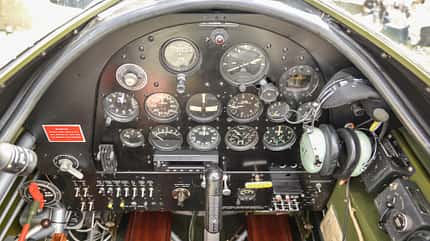 Über die linke Fläche führt der Weg ins vordere Cockpit, einst Arbeitsplatz des Air-Corps-Kadetten. Die BT-13 ist ein simples und sehr mechanisches Flugzeug. Bis auf das Bremssystem gibt es keine Hydraulik. Trimmung und Landeklappen werden über Stellräder und Kurbeln betätigt, das Fahrwerk ist nicht einziehbar.