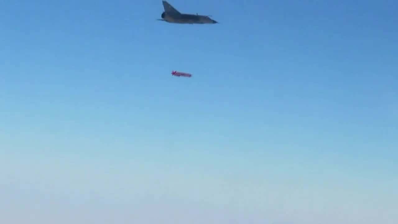 Der wuchtige Taimoor-Marschflugkörper hängt beim Test unterm Rumpf der Mirage III. Er soll mindestens 600 Kilometer weit fliegen können.
