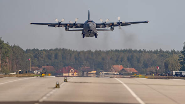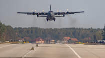 Wir haben kaum die Kameras gezückt, da hören wir von fern auch schon das vertraute Dröhnen der vier Allison-Turboprops. Eine flimmrige Silhouette schiebt sich untermalt davon am Horizont in Position, nimmt auf der Straße Fahrt auf – und röhrt Sekunden später, vier dicke Rauchschwaden im Schlepptau, im Tiefflug über uns hinweg. Dann ist Ruhe. Feierabend. Das PR-Event der polnischen Luftwaffe an der DW 604 hat ein Ende. Die richtig echte Übung, das ist uns längst klar, war eigentlich am Mittwoch schon vorbei. Das hat uns nur keiner gesagt, jedenfalls nicht im Vorfeld. Ich verabschiede mich von den Holländern. Wir lachen. Galgenhumor? Nicht nur. Lustig war es ja irgendwie doch, auf eine gewisse Weise.