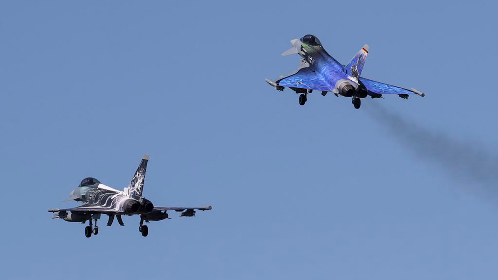 Gleich zwei bunte Eurofighter wollte die Luftwaffe dem geneigten Publikum auf der ILA in Berlin vorstellen. Die Corona-Pandemie machte der Sache einen Strich durch die Rechnung – die Messe wurde abgesagt. Doch die Beteiligten am Fliegerhorst Nörvenich ließen sich davon nicht beirren: Sie hüllten die beiden Kampfjets trotzdem in bunte Folie. Dass das eine gute Entscheidung war, beweisen die fertig folierten Jets auf den ersten Blick. Beide zeigten sich nun erstmals öffentlich. Verstecken müssen sie sich nicht.