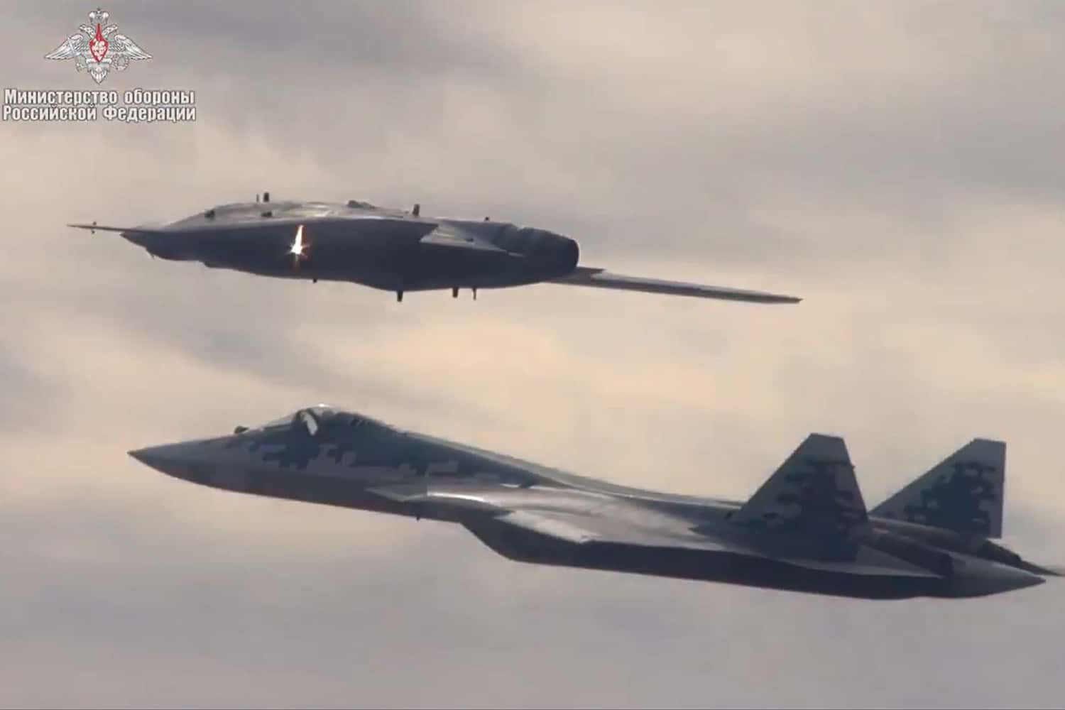 Bemannte und unbemannte Stealth-Flugzeuge im Verbund: so stellt sich die russische Luftwaffe Kampfszenarien der Zukunft vor. Am 27. September fand nun die erste derartige Zusammenkunft am Himmel über Russland statt, wie die Nachrichtenagentur Tass unter Berufung auf das russische Verteidigungsministerium berichtet. Zum ersten Mal flogen die Stealth-Drohne Ochotnik (deutsch: „Jäger“) und Russlands Top-Fighter der fünften Generation, die Suchoi Su-57 im Verbund. In enger Formation zogen die beiden Zukunfts-Fighter ihre Kreise – laut Tass-Angaben mehr als 30 Minuten lang.