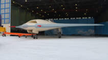 Doch auf dem Schlachtfeld der Zukunft soll die Su-57 keineswegs allein agieren. Stattdessen stellt Suchoi dem neuen Kampfjet eine Stealth-Drohne als "loyalen Flügelmann" zur Seite. Die S-70 Ochotnik, Anfang August 2019 zum Erstflug gestartet und seither in Achtubinsk beim staatlichen Flugforschungszentrum "Waleri Tschkalow" in Erprobung, soll diese Rolle plangemäß ab 2024 übernehmen. Für diesen Zeitraum plant Russland mit der Übernahme der ersten Serienexemplare. Die bislang bekannten Fotos und Rahmendaten der S-70 zeichnen das Bild einer großen Nurflügler-Drohne, bis zu 20 Tonnen schwer und angeblich 1.000 km/h schnell. Die beim ersten Prototypen noch konventionell ausgelegte Schubdüse des einzigen Triebwerks soll bei späteren Versionen einer flachen Düse weichen, um die Radarsignatur weiter zu minimieren.