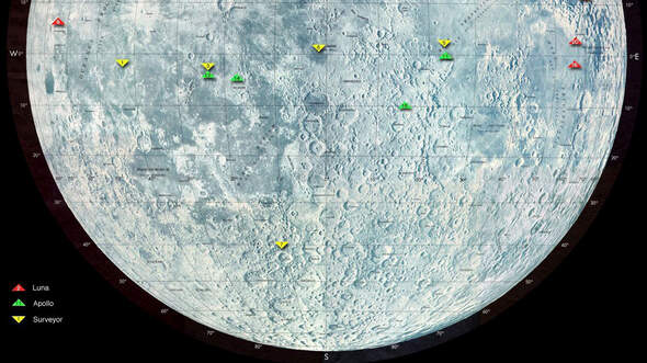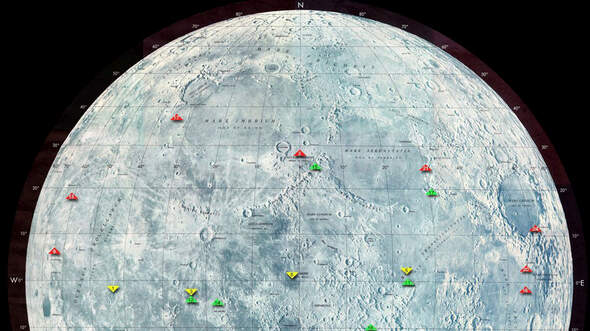 Landeplätze der bisherigen, geglückten Mondlandungen (südliche Hemisphäre).
