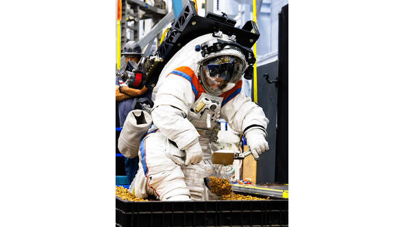 Ein Axiom-Ingenieur testet den neuen Mondanzug namens AxEMU auf seine Tauglichkeit bei Probenentnahmen auf der Mondoberfläche.