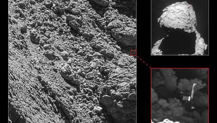 Die hochauflösende OSIRIS-Telekamera der Rosetta-Sonde machte erstmals Aufnahmen, auf denen der Lander Philae auf der Oberfläche des Kometen "Tschuri" zu sehen ist. Die Bilder entstanden am 2. September, als die Sonde in einer Entfernung von rund 2,7 Kilometer um den Kometen flog. Das teilte die europäische Raumfahrtagentur am Montag mit.