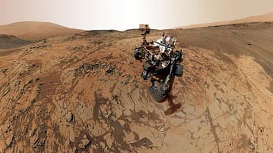 Rover kämpfen sich durch endlose, staubige Geröllwüsten, Orbiter studieren den rostroten...