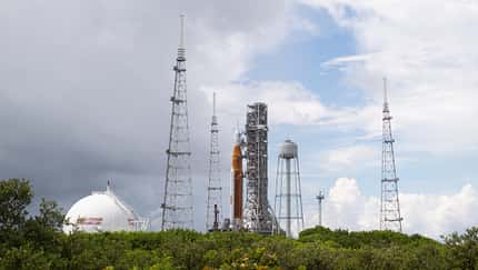 Im Rahmen der Artemis-1-Mission soll die SLS-Rakete erstmals fliegen und dabei die noch unbemannte Orion-Kapsel in eine Umlaufbahn um den Mond bringen.