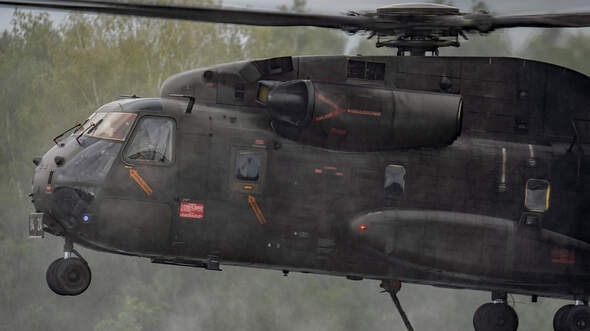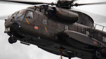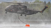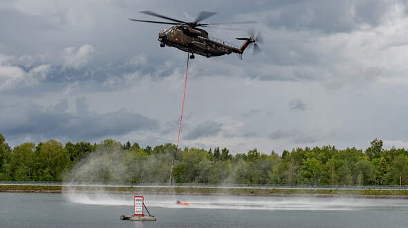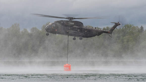 Soweit allerdings ist die Crew der CH-53 mit dem Taktischen Kennzeichen 84+24 jetzt noch nicht. Gerade lässt sie ihren Hubschrauber wenige Meter über der Wasseroberfläche schweben, damit der Eimer mit Lechwasser vollläuft. Aufsprühende Gischt hüllt das dunkelgrüne Ungetüm in einen feinen Nebel, das Dröhnen des von zwei GE T64-Turbinen beschleunigten Hauptrotors lässt Enten und Schwäne am nahen Ufer Deckung suchen. Das Fahrwerk bleibt bei der Wasseraufnahme stets ausgefahren – aus Sicherheitsgründen. "So können wir immer schnell und unvorbereitet landen, falls dies erforderlich sein sollte", unterstreicht Presseoffizier Locherer.