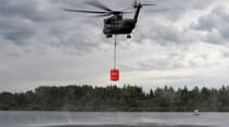 Schon nähert sich die erste CH-53 von Südwesten. Am Lastenseil baumelt ein feuerroter SEMAT F 5000-Löschbehälter der Feuerwehr Bad Tölz-Wolfratshausen. Gleich wird der Transporthubschrauber über dem Stausee einschweben und seinen roten Eimer in die Wasseroberfläche drücken. Die Windrichtung im Blick, umkurven die Piloten die anvisierte Stelle und drehen dann im Tiefflug von Norden her ein. Ihre Außenlast können sie dabei vom Cockpit aus nicht sehen. "Stattdessen koordiniert der Bordtechniker im Laderaum die Wasseraufnahme und sagt den Piloten an, wo sich der Behälter gerade befindet", erklärt Leutnant Stefan Locherer, Presseoffizier des HSG 64 in Laupheim. "Der Bordtechniker hat den Feuerlöschbehälter im Auge und kann ihn per Handsteuerung öffnen und schließen", so Locherer weiter. "Über dem Zielgebiet öffnet er den Behälter auf Kommando des Piloten."