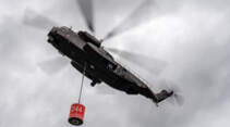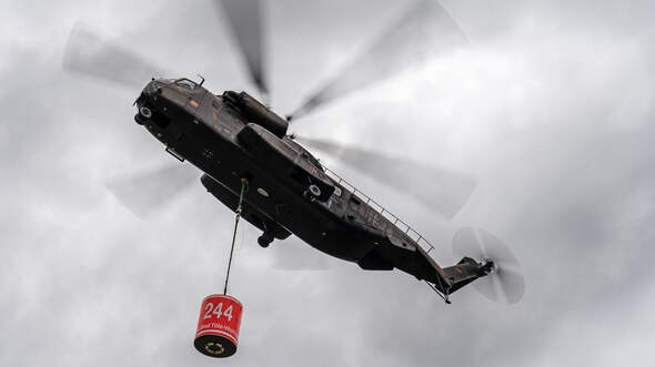 Scharf pfeift der Wind an diesem Dienstagmorgen über die Lechstaustufe, nördlich von Landsberg in Oberbayern. Am Himmel hängen dunkle Wolken: nichts mit Sonne satt und Badewetter! Aber zum Baden sind die Handvoll Bundeswehrsoldaten, die vom nahen Fliegerhorst Lechfeld angefahren kommen und an der Staumauer Stellung beziehen, auch nicht hier. Sie warten auf die beiden CH-53, deren fernes Wummern sich bereits akustisch in die pfeifenden Windböen mischt, und die in wenigen Minuten am Lech ihren großen Auftritt haben. Die Übung "Clear Water Lechfeld" steht an: Crews des Hubschraubergeschwaders 64 aus Laupheim üben das Feuerlöschen aus der Luft. Mit 5.000 Liter-Eimern am Haken mutieren Deutschlands größte Drehflügler am Lech zu Wasserbombern.