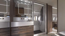 Die Kabine der Falcon 10X wurde als "Penthouse am Himmel" konzipiert, erläuterte Agnès Gervais, Design Manager für neue Programme, denn die Kundenwünsche gingen ganz klar Richtung Komfort. Auf Flügen, die bis zu 15 Stunden dauern können, ist es wichtig, sich wohlzufühlen beim Arbeiten, beim Essen und beim Ausruhen, damit man am Zielort "frisch und relaxed" ankommt, um sofort mit den anstehenden Geschäftstreffen zu beginnen.