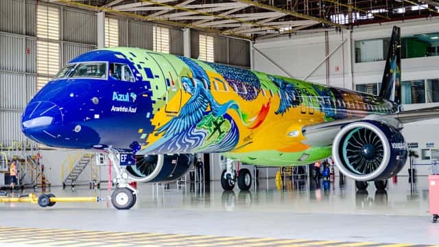 Azul selbst spricht vom farbenfrohsten Flugzeug in ganz Südamerika – und dürfte damit ziemlich Recht haben. Zehn Tage lang bemalten die Lackierprofis der Firma Tintas Coral im Embraer-Werk São José dos Campos die neue E195-E2 für Brasiliens drittgrößte Airline mit einem wahren Feuerwerk an Farbtönen – vereint zu einem einzigartigen Kunstwerk, das die biologische Vielfalt der Regenwaldnation widerspiegeln soll. Insgesamt 58 Farben finden sich auf dem Rumpf des Zweistrahlers mit dem Kennzeichen PS-AEF. 28 davon wurden laut Embraer speziell für das Vorhaben kreiert. Sie sind das Werk der Firma Akzo Nobel, einem Global Player in Sachen Farbenherstellung.
