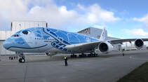 Der heute übergebene Superjumbo ist der erste von drei A380, die ANA bei Airbus bestellt hat. Sie alle sollen ausschließlich auf der Route Tokio-Honolulu zum Einsatz kommen. Die drei neuen Flaggschiffe der Japaner erhalten aus diesem Grund spektakuläre Sonderlackierungen mit Meeresschildkröten, die um Hawaii beheimatet sind. Dort tragen die Tiere, die für Wohlstand und Glück stehen, den Namen „Honu“. ANA nennt ihre Superjumbos deshalb liebevoll „Flying Honu“ und möchte mit der Lackierung auch darauf aufmerksam machen, dass die hawaiianischen Meeresschildkröten akut in ihrem Bestand bedroht sind.
