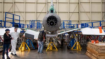 Eigentlich hätte die X-59 noch vor Jahresfrist ihren Erstflug feiern sollen. Doch daraus wird nichts. Laut NASA wird der Überschall-Versuchsjet nun erst 2023 in die Luft steigen – und muss sich zuvor noch den obligatorischen Bodentests unterziehen. Nichtsdestotrotz schreitet das Projekt sichtbar voran. Vergangene Woche meldete die NASA einen wichtigen Meilenstein auf dem Weg zum Jungfernflug: Hersteller Lockheed Martin hat dem Unikat mit der langen Nase endlich seinen Antrieb spendiert: Ein 97,9 kN starker F414-GE-100-Turbofan aus dem Hause General Electric füllt ab sofort den Rumpf des "leisen" Überschallflugzeugs aus.