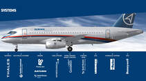 Insgesamt rund 40 Komponenten westlicher Zulieferer hat UAC im Zuge der "Importsubstitution" beim neuen Superjet SJ-100 gegen russische Pendants ausgetauscht. Dazu zählen zum Beispiel das Fahrwerk, die Avionik und die Flugsteuerung, sowie die Hilfsgasturbine, die Stromversorgung, das Brandschutzsystem, die Klimaanlage und viele weitere Bereiche. Einen Schönheitsfehler jedoch ist der SJ-100-Prototyp bis zu seiner Flugpremiere nicht mehr losgeworden. Denn das eigentlich für den russifizierten Superjet vorgesehene Triebwerk PD-8 von Awiadwigatel hinkt dem Flugzeug selbst noch etwas hinterher. Sprich: Unter den mit "Sabrelets" bestückten Flügeln des SJ-100 arbeiten derzeit noch zwei "alte" SaM-146-Turbofans des französisch-russischen Joint-Ventures Powerjet. Das PD-8 steckt noch in den Zulassungstests. Erst die zweite SJ-100, so der Plan, wird von Beginn an mit dem neuen, rein russischen Turbofan bestückt sein.
