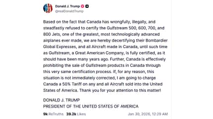 Wörtlich heißt es in dem Beitrag vom 30. Januar: "Aufgrund der Tatsache, dass Kanada die Zertifizierung der Gulfstream 500, 600, 700 und 800, eines der größten und technologisch fortschrittlichsten Flugzeuge, das jemals gebaut wurde, verweigert hat, entziehen wir hiermit den Bombardier Global Express und allen in Kanada hergestellten Flugzeugen die Zertifizierung, bis Gulfstream, ein großartiges amerikanisches Unternehmen, vollständig zertifiziert ist, wie es schon vor vielen Jahren hätte geschehen sollen. Darüber hinaus verbietet Kanada durch genau dieses Zertifizierungsverfahren effektiv den Verkauf von Gulfstream-Produkten in Kanada. Sollte diese Situation aus irgendeinem Grund nicht umgehend korrigiert werden, werde ich Kanada einen Zoll von 50 % auf alle Flugzeuge auferlegen, die in die Vereinigten Staaten von Amerika verkauft werden. Vielen Dank für Ihre Aufmerksamkeit in dieser Angelegenheit!"