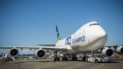 Boeing unterstützt die "Seattle Seahawks" - mit einer 747 in Sonderlackierung. Die große "12" am...